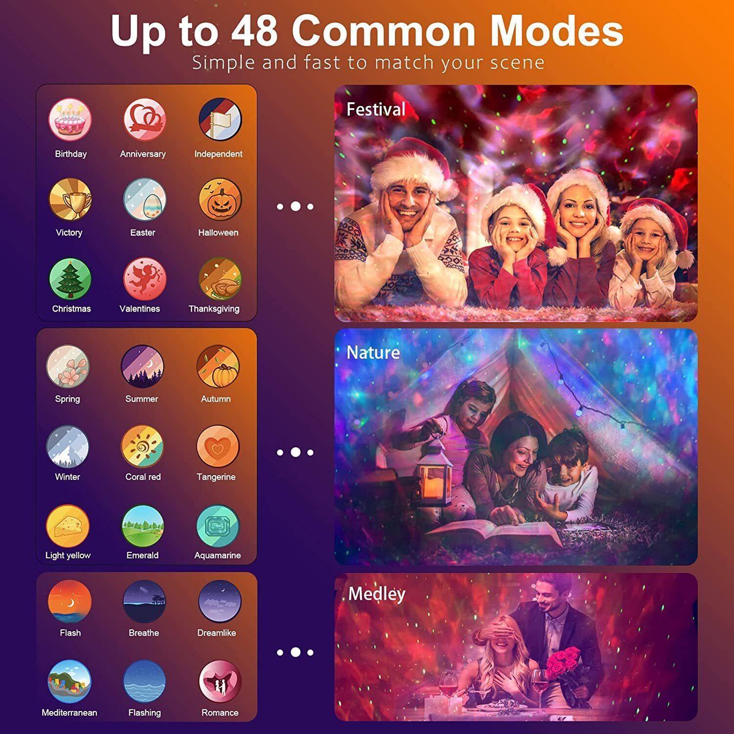 48 Preset Scene Effects and Custom DIY SceneVia phone App, choose from vibrant animated effects based on nature, emotions, holidays, birthday, festival, party and more to find the proper lighting effects that fit your emotions. The create custom scene function is a huge help, through varying levels of brightness and speed, color and stars options, Dynamic selection to build your very own favorite effects, create personalized lighting for your gaming room, living room, bedroom etc.